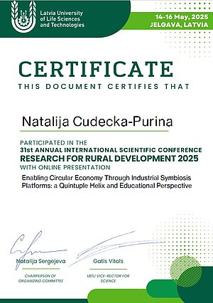 2025. gada pavasarī, vadošā pētniece – profesora granta saņēmēja prof. Natālija Cudečka-Puriņa prezentēja pētījuma rezultātus ziņojumā “Enabling Circular Economy Through Industrial Symbiosis Platforms: a Quintuple Helix and Educational Perspective” starptautiskā konferencē “Research for Rural Development 2025”, ko organizēja Latvijas Biozinātņu un tehnoloģiju universitāte. Savā ziņojumā profesore secina, ka kad ražošana, zinātne, un sabiedrība virzās uz vienotiem mērķiem un sadarbojas, tādējādi veicinot arī vides kvalitāti, pat atkritumi kļūst par iespēju. Ziņojums raisīja diskusiju, kuras laikā profesora granta saņēmēja ieguva vērtīgas atziņas tālākai pētījuma attīstībai.