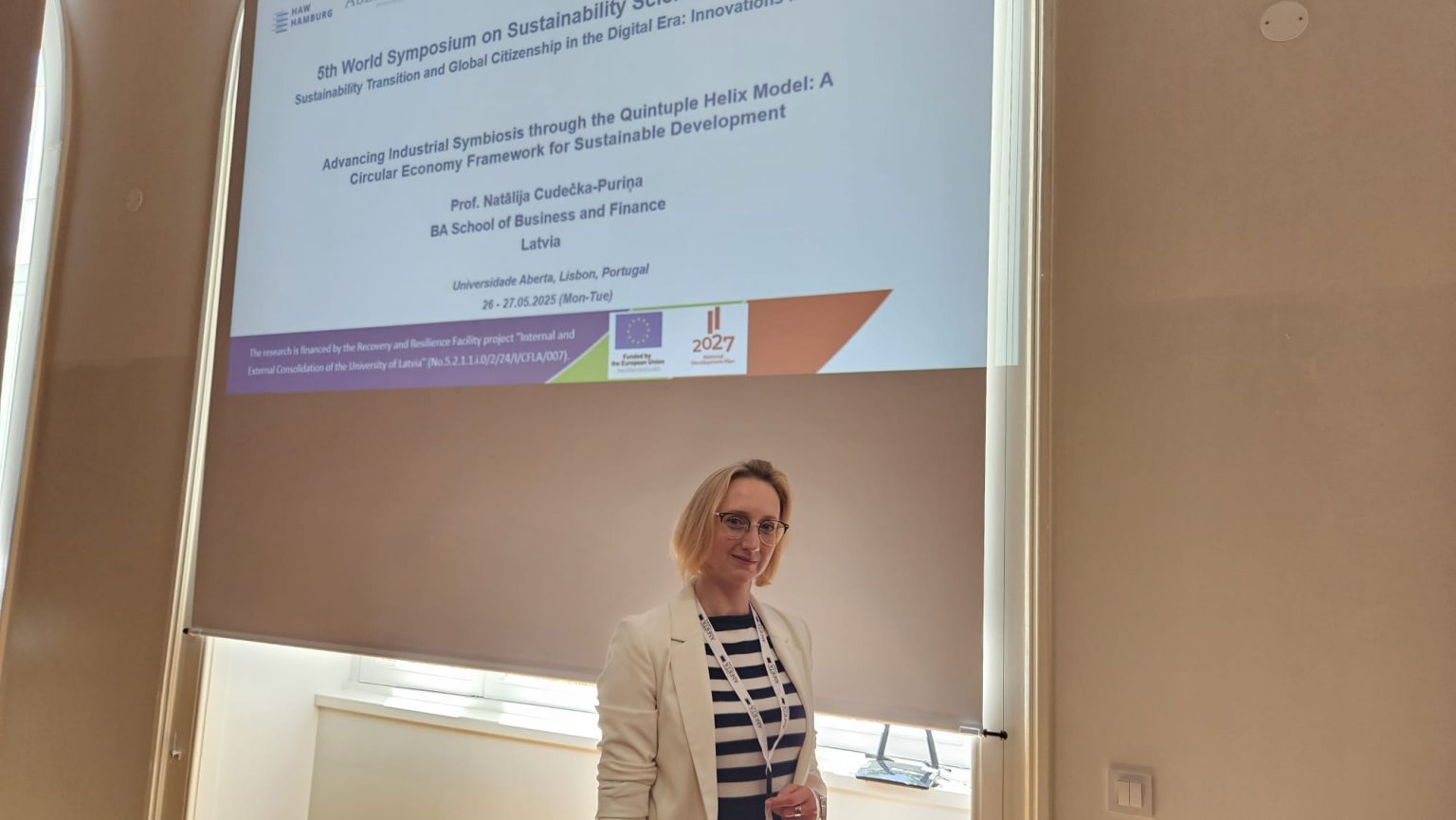 Vadošā pētniece – profesora granta saņēmēja N. Cudečka-Puriņa simpozija dalībniekiem prezentēja ziņojumu “Advancing Industrial Symbiosis through the Quintuple Helix Model: A Circular Economy Framework for Sustainable Development”, kurā tiek analizētas industriālās simbiozes potenciāls aprites ekonomikas ietvaros, izmantojot pieckāršās spirāles modeli (Quintuple Helix), kas sasaista akadēmisko vidi, industriju, valdību, sabiedrību un vidi. Veiktā pētījuma rezultātā tika izstrādāti priekšlikumi, kā starpnozaru sadarbība var paātrināt ilgtspējīgas attīstības mērķu sasniegšanu. Pētījums veikts zinātnieku (profesoru) granta Nr. LU-BA-ZG-2024/1-0008 pētījuma “Pieckāršās spirāles (Quintuple helix) aprites biznesa modeļa izstrāde Industriālai Simbiozei” (Nr. LU-BA-ZG_2024/1-0008) ietvaros.
