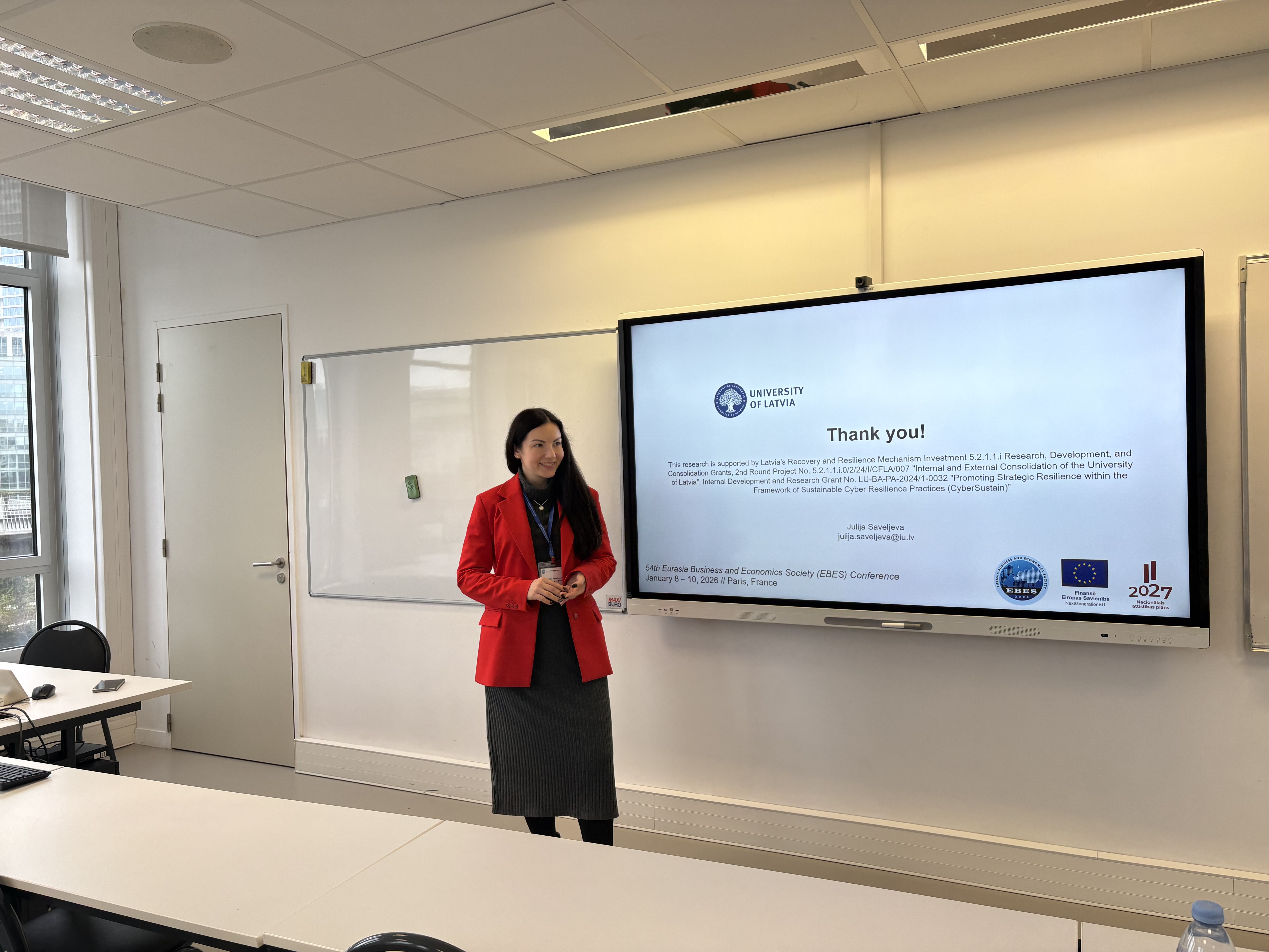 No 2026. gada 8. līdz 10. janvārim Parīzē, Francijā, norisinājās 54th Eurasia Business and Economic Society Conference, kurā Latvijas Universitātes Banku augstskolas un Latvijas Universitātes pētījuma “Stratēgiskās noturības veicināšana ilgtspējīgas kibernoturības prakses ietvaros (CyberSustain)” (granta nr. LU-BA-PA-2024/1-0032) komandu pārstāvēja vecākā eksperte PhD cand. Jūlija Saveļjeva un vadošā pētniece Inga Uvarova (LU Banku augstskola).
